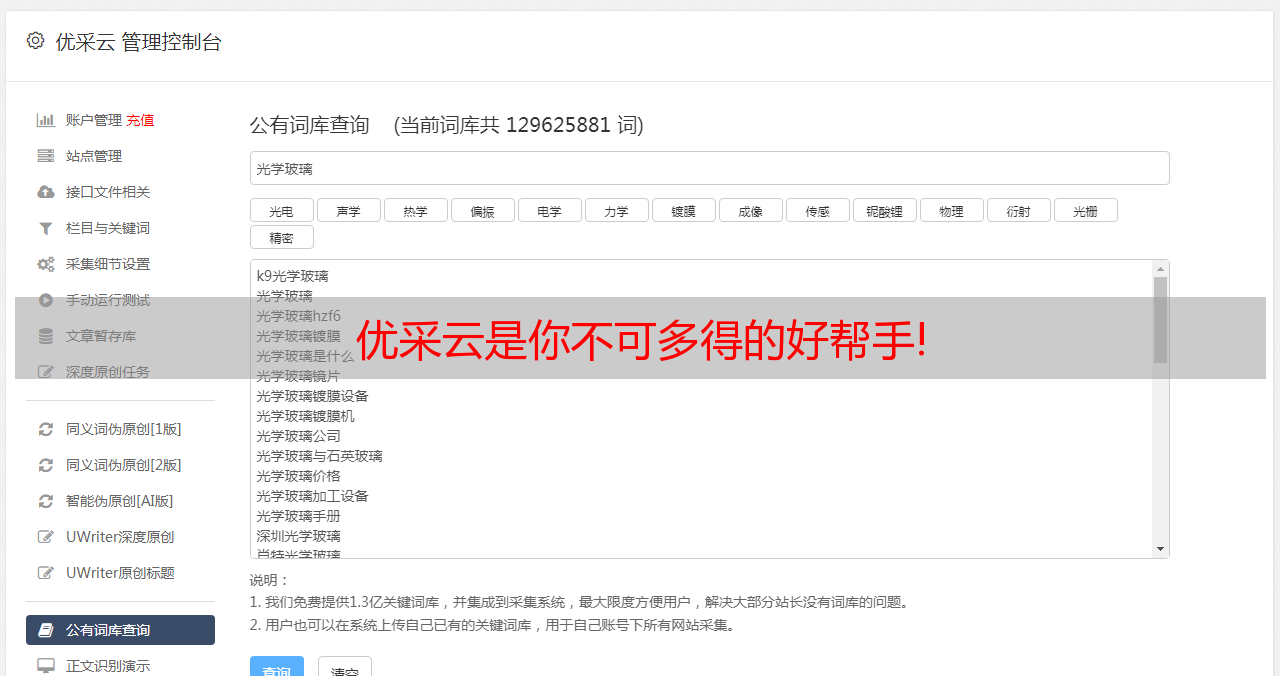优采云是一款在线自动生成高质量文章的工具,它可以帮助用户实现快速、高效、低成本的写作。它通过机器学习和人工智能技术,将用户输入的原始信息快速处理为与原始信息相关的文章。它可以根据用户不同的需求生成不同风格、不同长度、不同难度的文章。