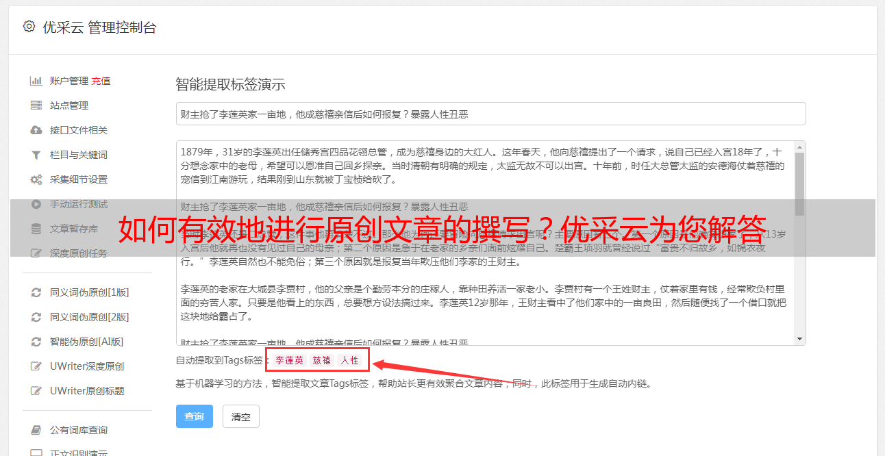 优采云是一款由国内领先的AI 技术开发商 UCAI 运营的原创文章生成软件,它能够帮助企业快速生成专业水平的文字内容,而不用花费不必要的时间和精力。