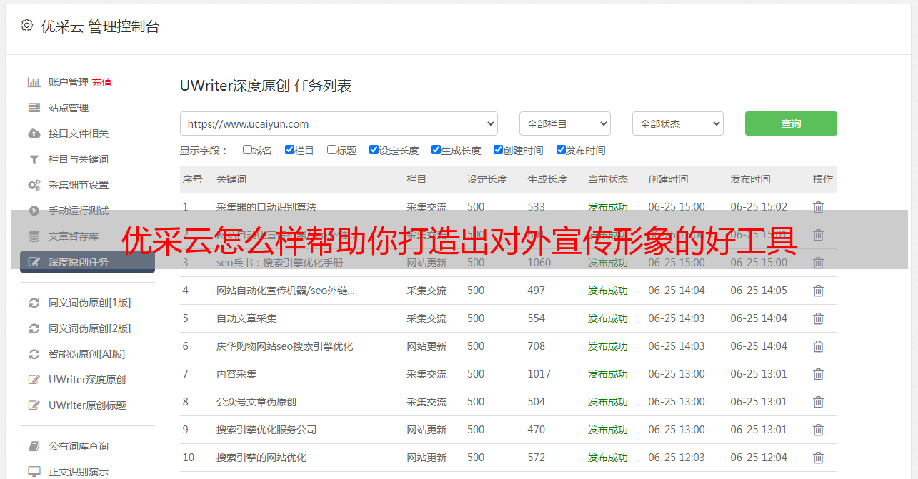 使用优采云可以快速生成高质量的文字内容,而且能够克服审美疲劳、时间成本、人力成本方面的问题。通过数据分析助力用户的原创内容建设,努力做到“有效+快速+省心”。