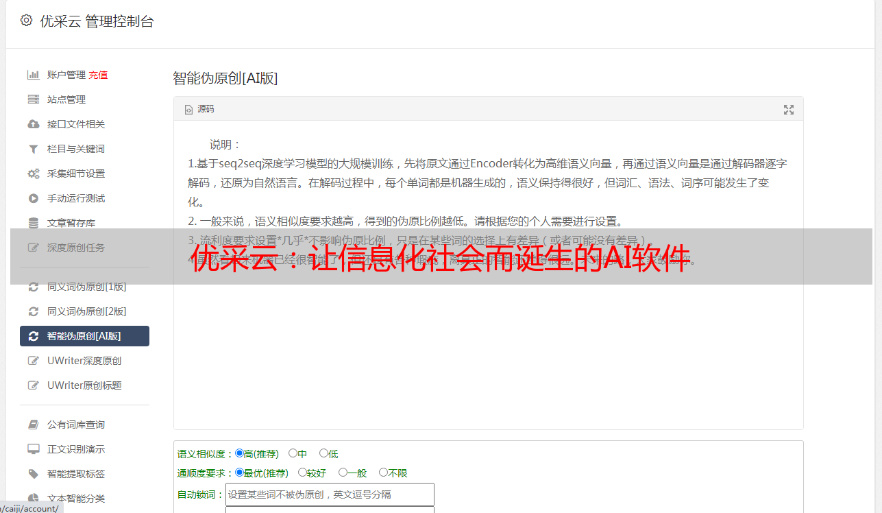 优采云是一款集文章自动生成、文章标题优化、文章自动旋转、文字内容分词等多项功能于一体的AI文档处理工具。它为用户提供了一个全新的、快速、方便、高效的创作体验,是目前行业中最具前瞻性和最受用户欢迎的工具之一。