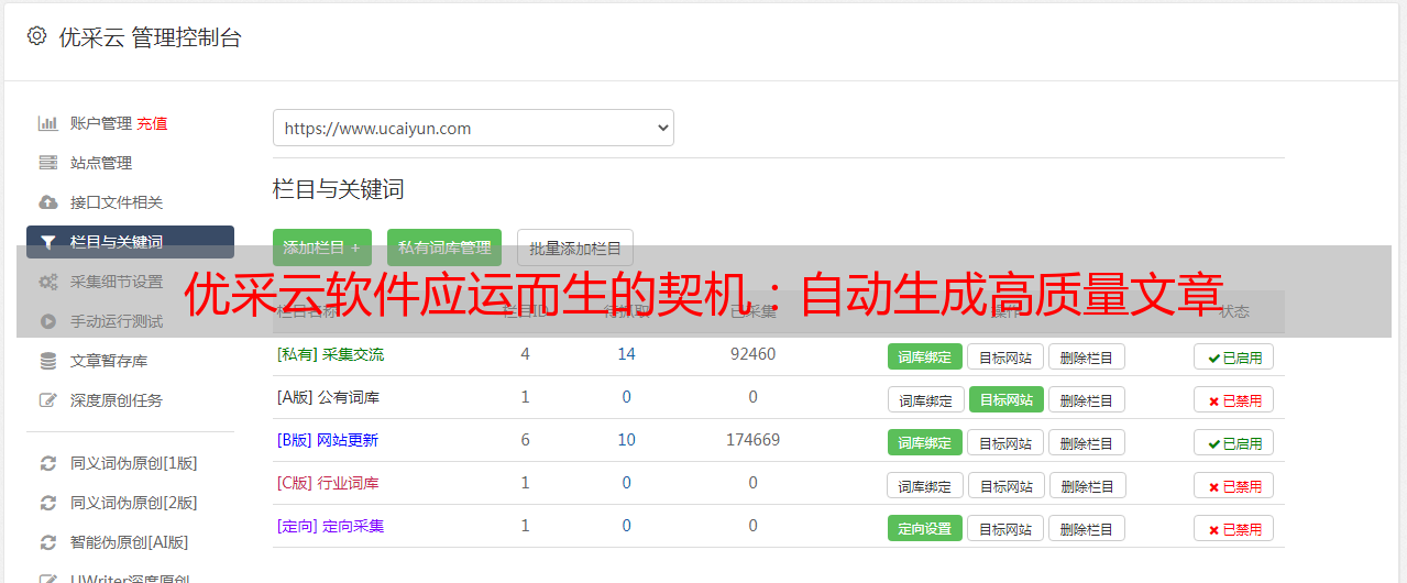 总而言之,优采云是一个革命性的内容生成工具.它不但可以帮助你快速生成高质量文章,而且能够有效帮你快速监测行业信息、创建图表并对内容进行相关分析;你将能够在勤奋中看到明显效率上升50%以上!不要再浪费你宝贵的时间去手动创作内容!快来www.ucaiyun.com 上体验优采云吧!