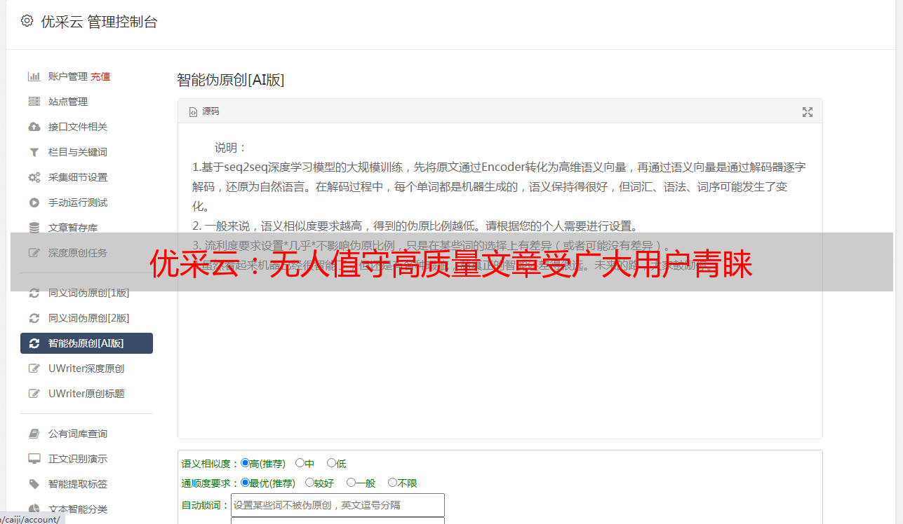 优采云是一家专门在AI语义理解领域有较高想法的公司。该公司已经开发出多款无人值守自动生成高质量文章的应用程序,这些应用能够有效实现对原始文本的语义理解和分析,并且能够根据原始文本中包含的信息来高效生成新文章。