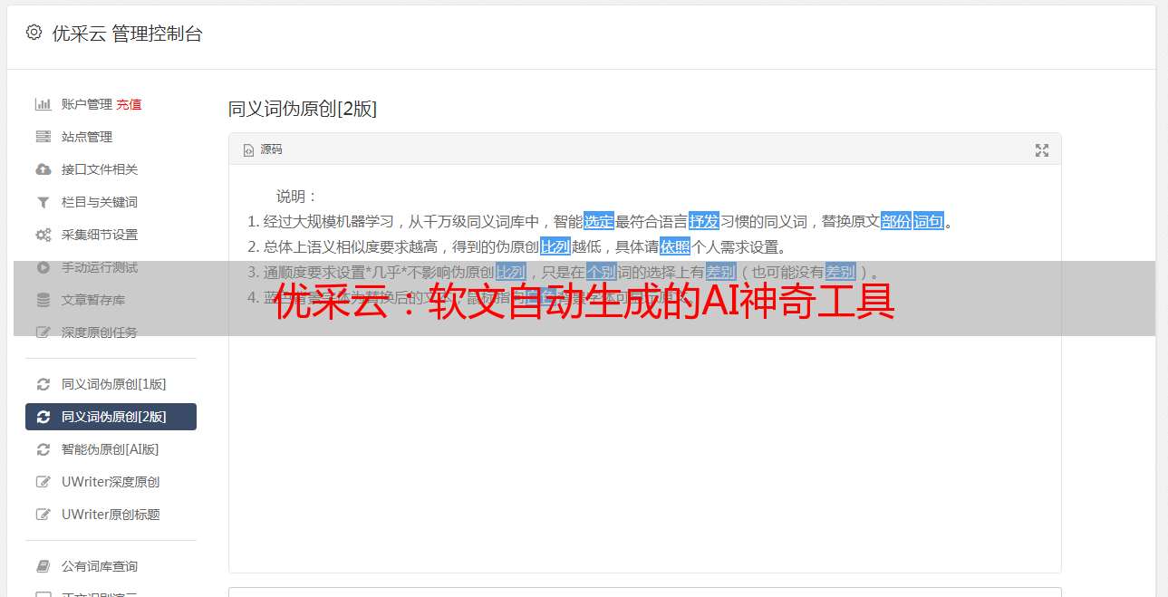 优采云(www.ucaiyun.com)是一款专业便捷高效的软文自动生成工具。它以AI机器学习为根基,利用大数据分析人工智能加上海量语料库,通过不断学习、总结和归纳,将信息从大量原始数据中进行采集、整理和加工处理,然后再以AI生成引擎对关键词进行分词、语法分析,实时对原始文章进行多维度处理(包含关键词、语义、情感、图片、声音、视频等多种形式内容的处理都可以通过该工具来实现),从而大大减少了人工制作文章所耗费的时间。