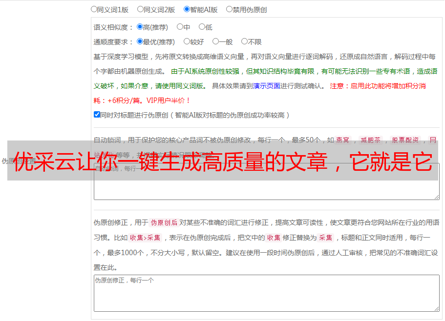 优采云(www.ucaiyun.com)是一款云端文章生成工具,能够帮助用户快速生成高质量文章,只需要将关键字和要素添加到优采云里,就可以轻松快速地生成出100%原创、高效、准确的文章。用户也可以根据自己的想法来修改处理文章,而且还能够实时检测文章是否重复。