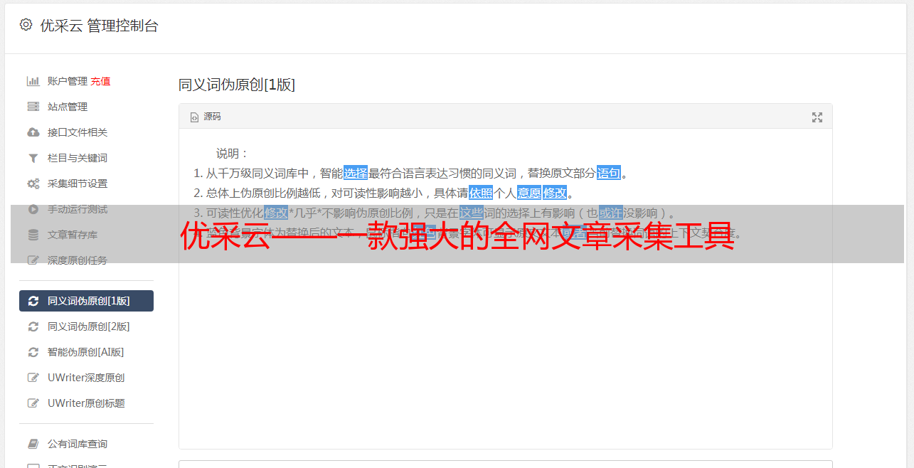 为此,我们引入了优采云—一款强大的全网文章采集工具。优采云是一款专业的全网文章采集工具,可以将各个网站上的各种原创内容进行准确采集。它采用多重技术手段如AI人工智能、关键词匹配、正则匹配等多种方式,不仅能够解决用户快速地将原创内容进行准确采集的问题,同时还能够将采集内容进行格式转化、对原创内容进行语义分析及数据清理工作,赋予原始文本带有逻辑思考加以评估并收录在优采云平台中。