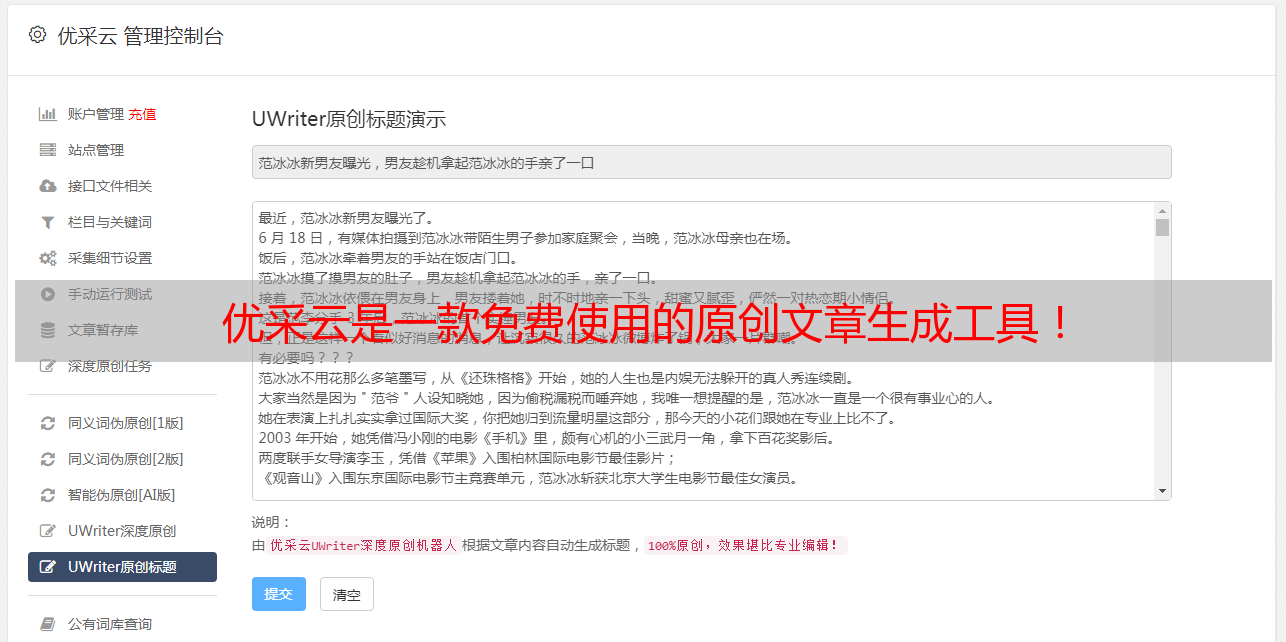 总之,作为一款先进而方便易用的原创文章生成工具,优采云将是你在快速打造原创文章时不能忽略的有效工具。它使用方便、功能强大!如果你想要尝试一番使用效果——就来www.ucaiyun.