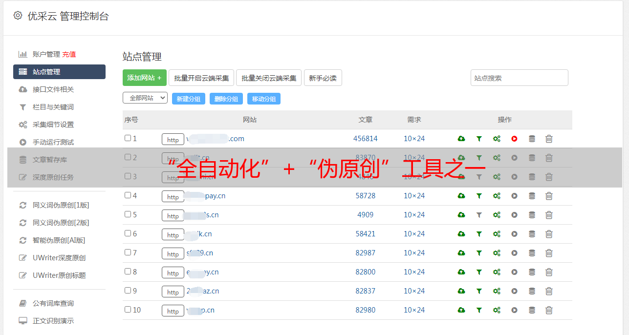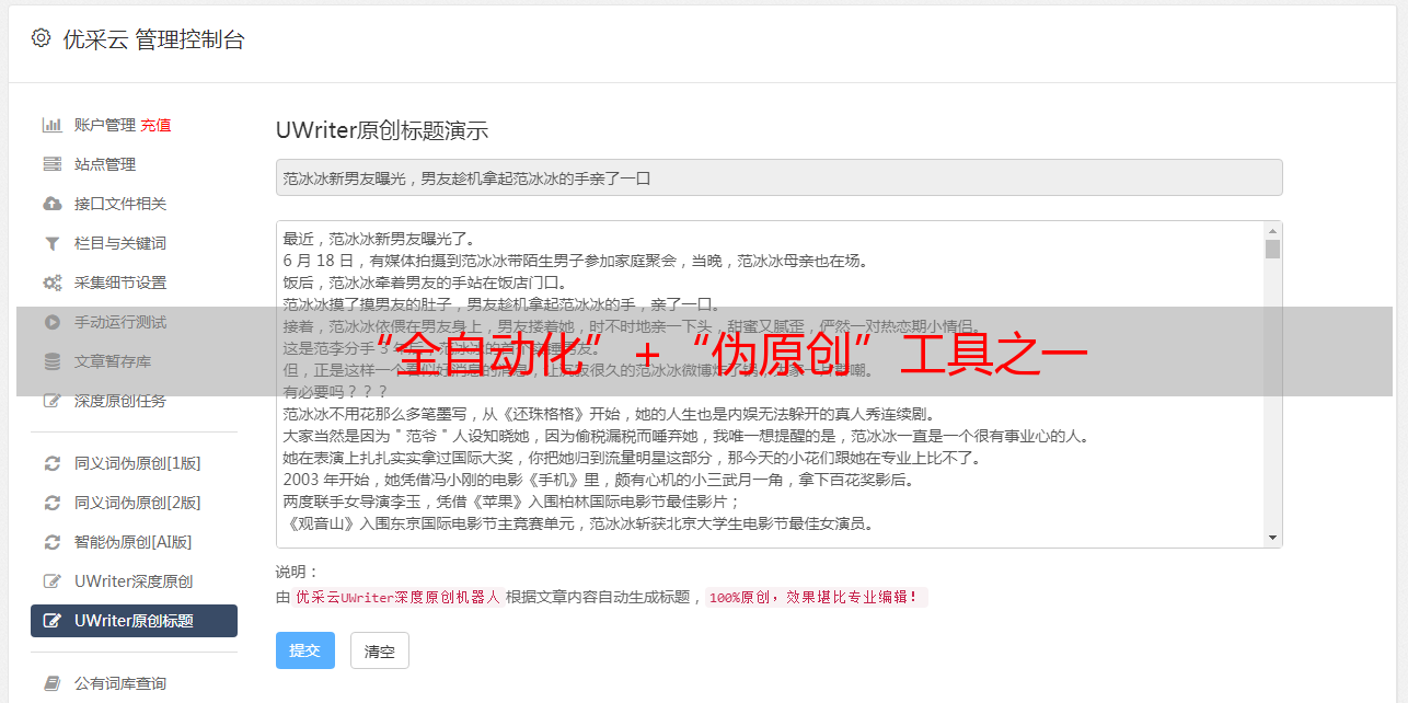 此外,优采云还将伪原创作为一大卖点,能够根据用户不同的需要对文章进行全自动化、快速地伪原创处理:用户只需将文章上传到工具中即可,然后通过工具中强大的AI系统即可快速生成看上去实用、有创意、独特性的新文章。而且该工具中AI也能够自动识别文章中的正误,从而保证生成出来的新文章质量上乘。