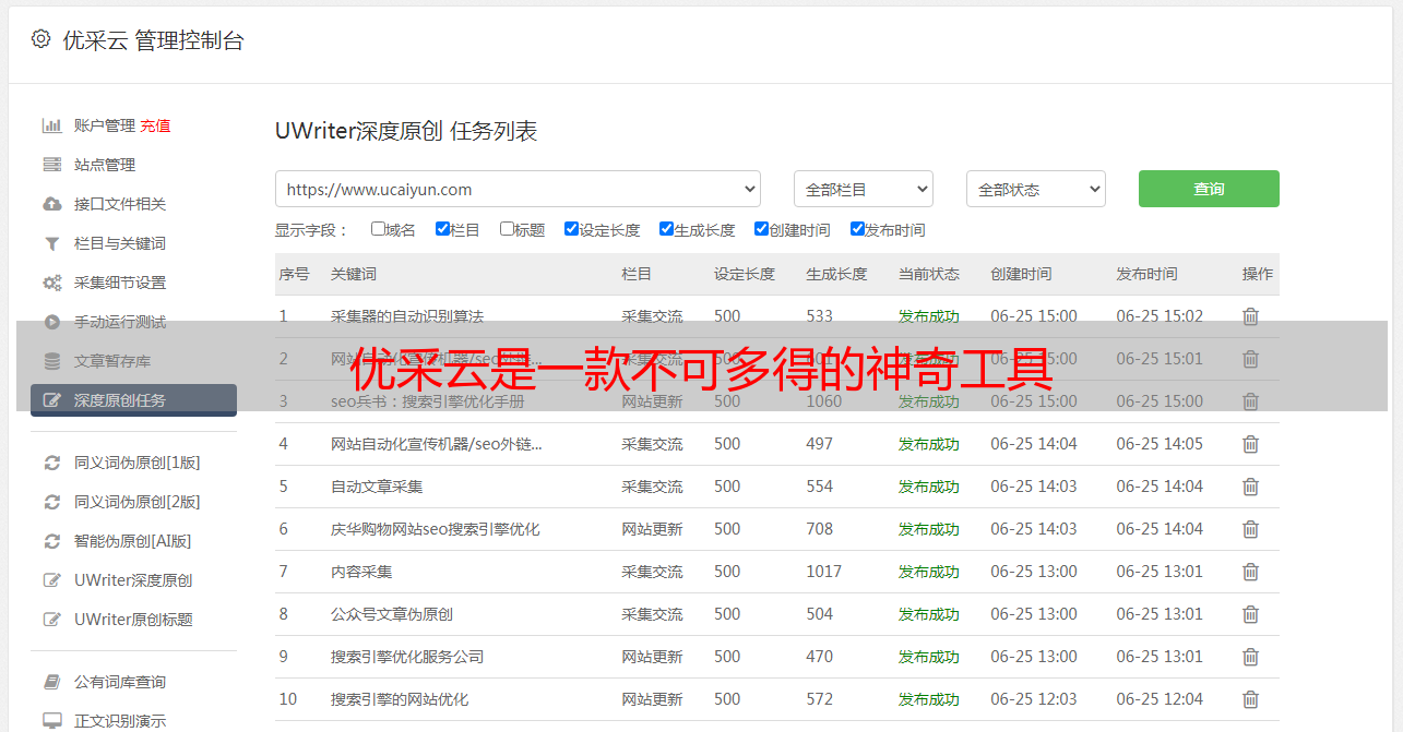总之,优采云是一款不可多得的神奇工具,具有强大而便利的功能,能帮助用户快速生成高质量文章,极大地减少写作时间,也为专业人士带来帮助.想要体验优采云神奇之处,就快去官方网站 www.ucaiyun.com 上体验一番吧!