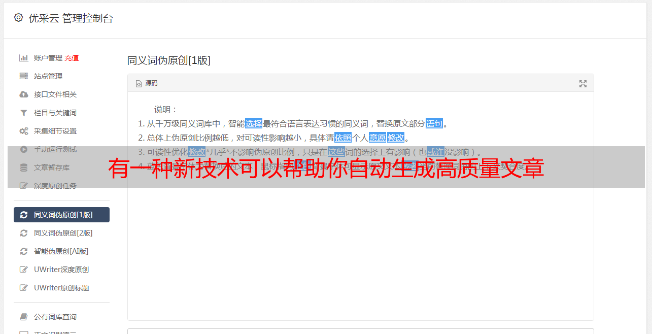 优采云 发布时间: 2022-12-31 10:40今天,有一种新技术可以帮助你自动生成高质量文章——优采云。优采云是一款先进的自动写作平台,旨在帮助用户快速产生高质量文章,目前已在业界得到广泛应用。