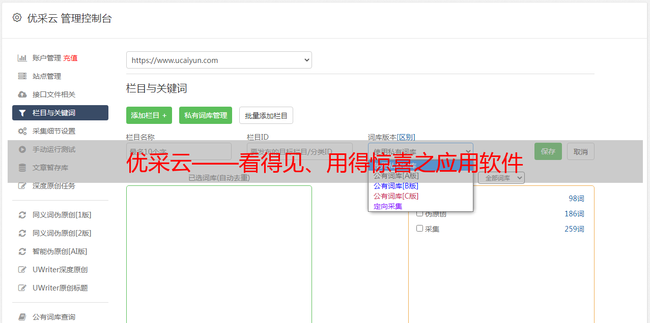 官方网站是www.ucaiyun.com ;在此平台上你可以找到详尽耐心周到之人工服务团队——包含各式各样、不吝利用之使用教学说明——并拥有看得到、用得惊喜之应用体验感。因此,如果你想要对企业内部之文章生成工作取得便利快速之成就时——不如考虑尝试一下“优采云”这样一款出色之应用工具吧!