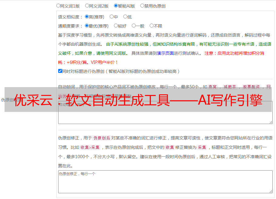 此外,优采云还具有语法校正、重复句子去除以及对文章整体风格进行校准等功能。这样就不用再去勤快地进行大量人工修正了——AI写作引擎只要几分钟便可以帮助用户生成卓越的69er度内容。