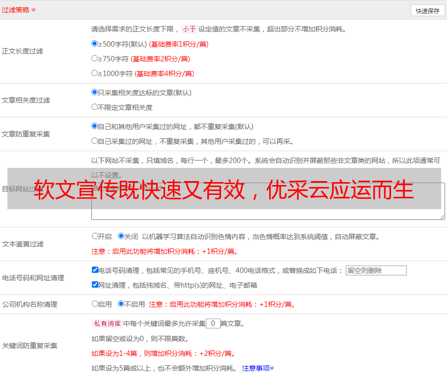 一方面,优采云能够根据用户的需求将相关内容进行整合归纳,不仅可以有效地减少用户的创作时间,还可以帮助用户将内容以最直接易懂的语言表述出来。另外一方面,优采云还能够根据市场行情、社交媒体上的话题热度、流行信息等追踪分析出当下最流行的话题和热点新闻并提供给用户以便及时分享出去;此外,优采云还可以根据用户所需要的关键词生成和对应关键词匹配度很高的文章内容;例如低价物品促销、明星代言、商场打折之类。有效地使用优采云,不仅能够帮助用户快速生成各种主题下的文章内容,还能够有效规避市场上各种广告*敏*感*词*。
