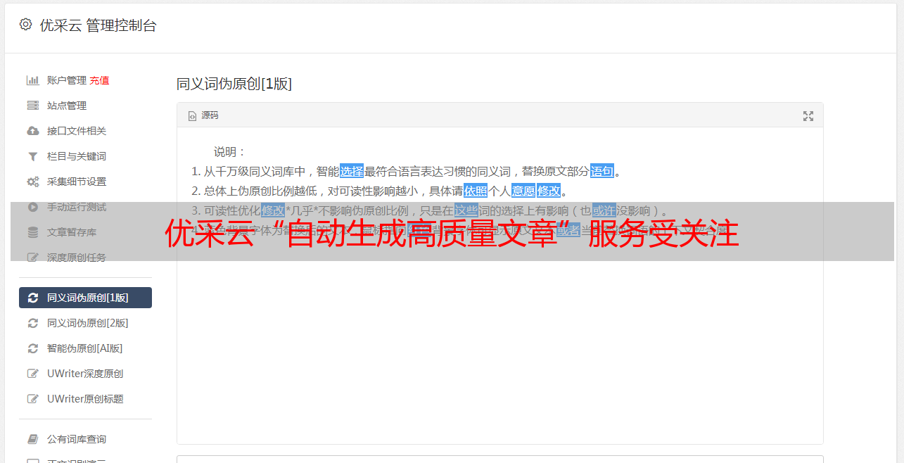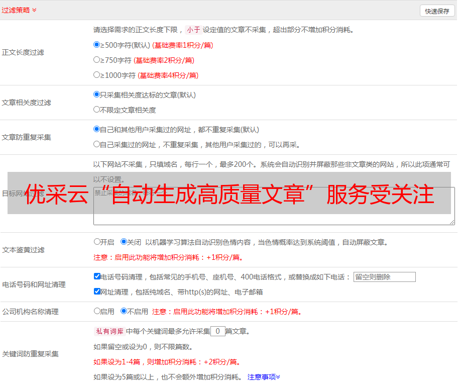 使用优采云“自动生成高质量文章”服务,能够帮助用户大大减少创作时间和工作量,有效提升文章内容质量,而且还能根据用户意愿进行修改整理。例如在大众媒体方面,优采云可以快速生成海量热门、有价值的新闻评论内容供客户使用;在医学行业方面,能够快速地生成医学语料库供医学人员使用;在企业宣传方面,可以帮助企业生成关注度高、准确性强的新闻内容;在教学方面,能够根据课程要求帮助老师快速生成课件内容;等等。