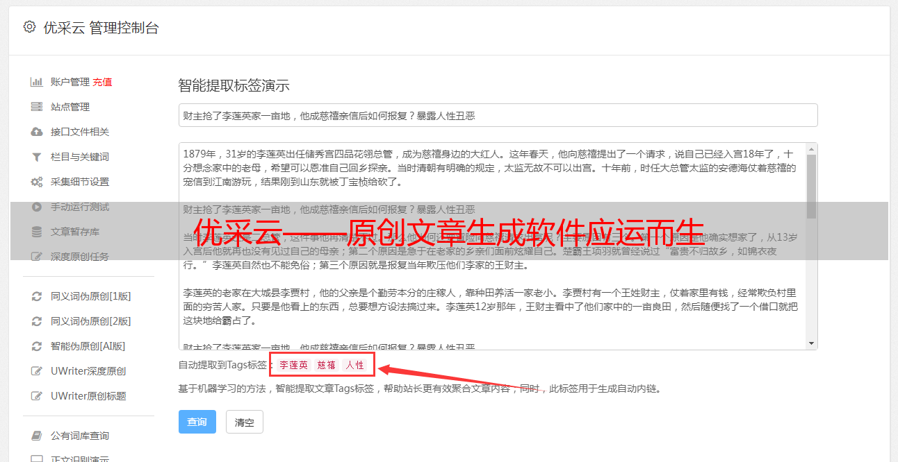 首先,它可以根据用户所需内容快速生成出文章,并帮助用户避免因为写作困难而时间浪费。使用优采云,用户只需一个主题即可快速生成数百字的原创文章——这对于很多时间有限的SEOer来说是一大便利。
