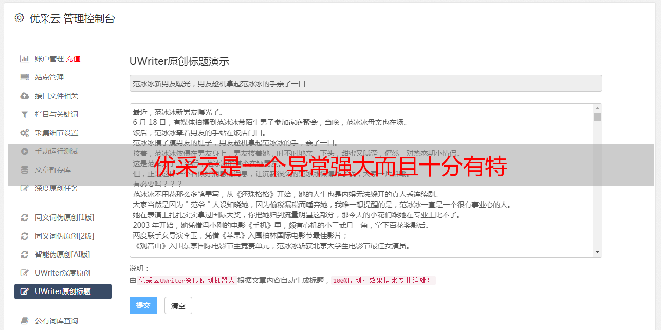 优采云是一款新型的高可读性文章自动生成工具。它可以有效帮助用户在短时间内快速生成高质量、高可读性的文章内容,而无需太多投入与精力。它在最近引起了不少关注,得到了不少用户的高度评价和大力支持。