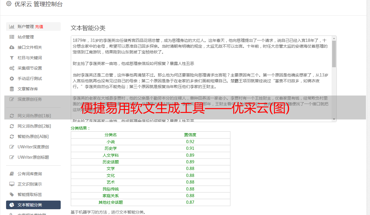 优采云是一款可以将原始文章快速、准确地生成具有专业水准的软文的工具。它能够快速理解用户需要表达的信息,把各种表述形式重新组合,使文章有更好的可读性和流畅性,帮助用户快速生成一批高质量的软文。它仅需要一份原始文件,就能快速生成十几份内容完全不相同的文章,无需语法分析、扩句、同义词和变形处理等复杂工作,即可实现一键创作。