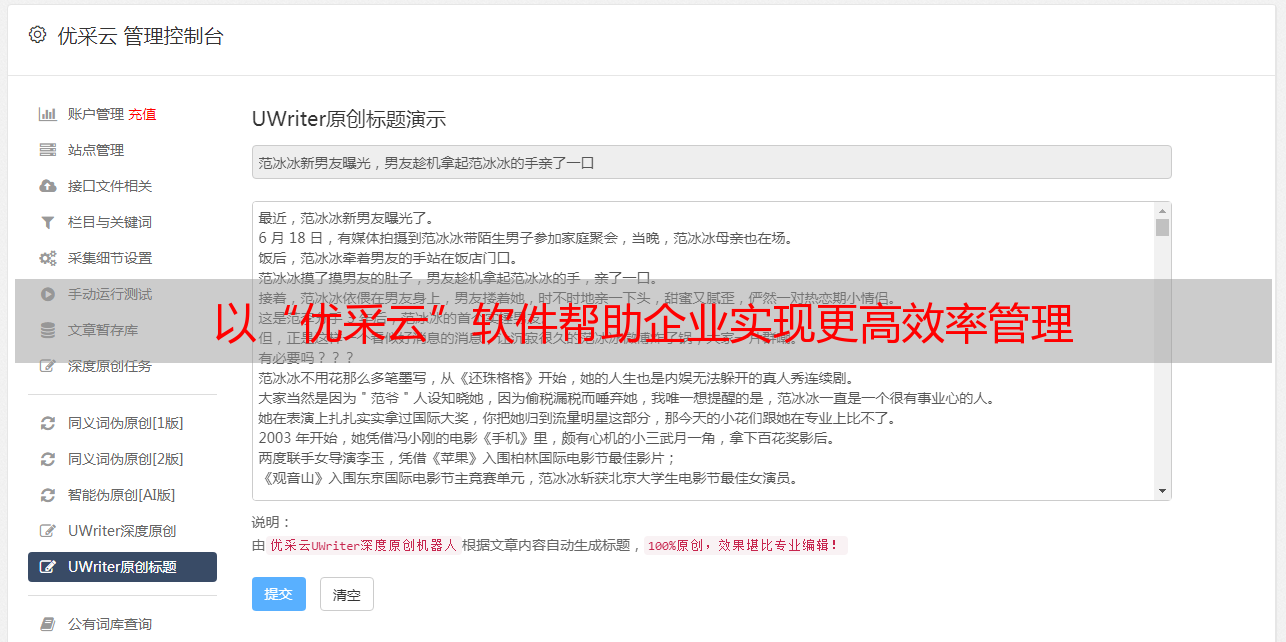 优采云 发布时间: 2022-12-31 21:41企业网站原创文章:以“优采云”软件帮助企业实现更高效率管理