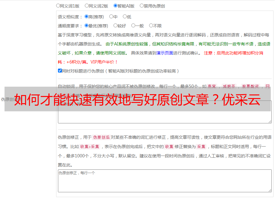 总而言之,优采云通过多项特性强大功能得以快速有效地帮助用户生成高质量的原创文章。想要体验优采云带来的好处吗?请快来 www.ucaiyun.com 注册使用吧~