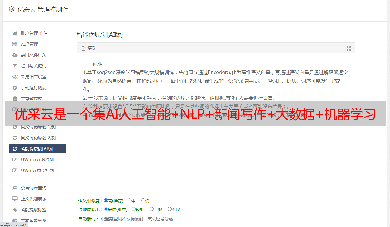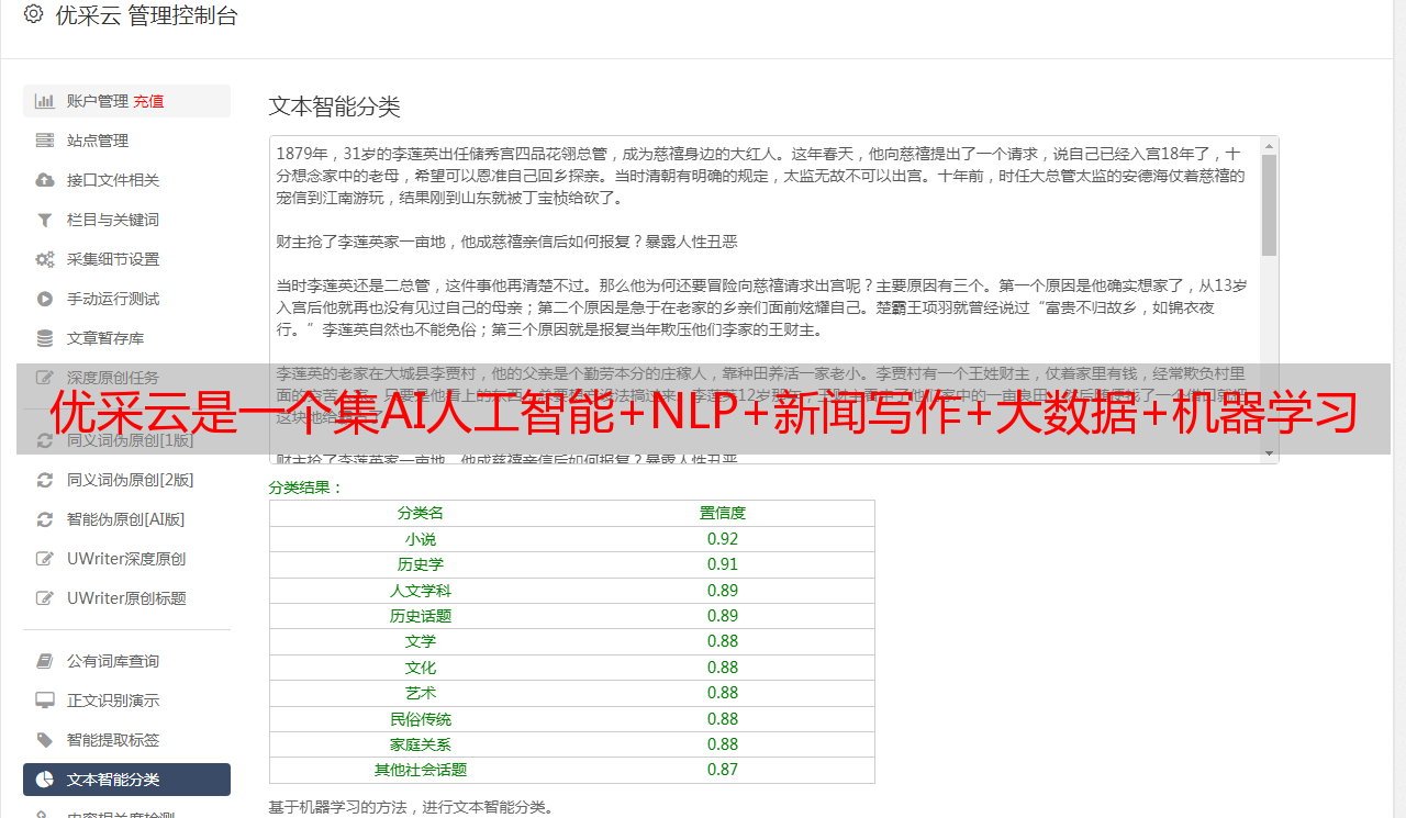 优采云是一个集AI人工智能+NLP+新闻写作+大数据+机器学习+场景应用