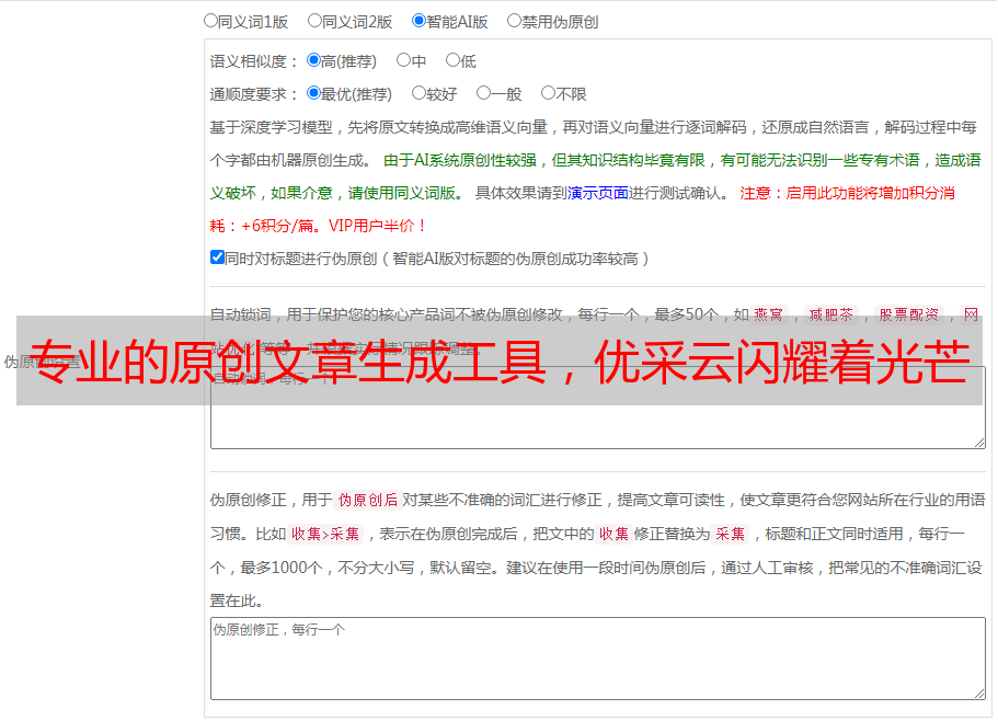 优采云是一款专业的原创文章生成工具,它采用了领先的AI自然语言处理技术,可以快速、高效地实现原创文章的生成。它能够根据用户的关键词、要求完成任务,大大地减少了人工写作所需要的时间和精力。