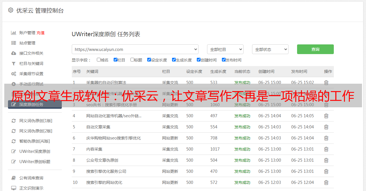 通过使用优采云原创文章生成软件,用户不但能够快速构建出形式完整、内容丰富、思路清晰的原创文章;同时也能够避免因为一味的独立思考耗尽大量时间及精力所带来的困境。有了优釅云原创文章生成软件,写作不再是一项枯燥的工作!