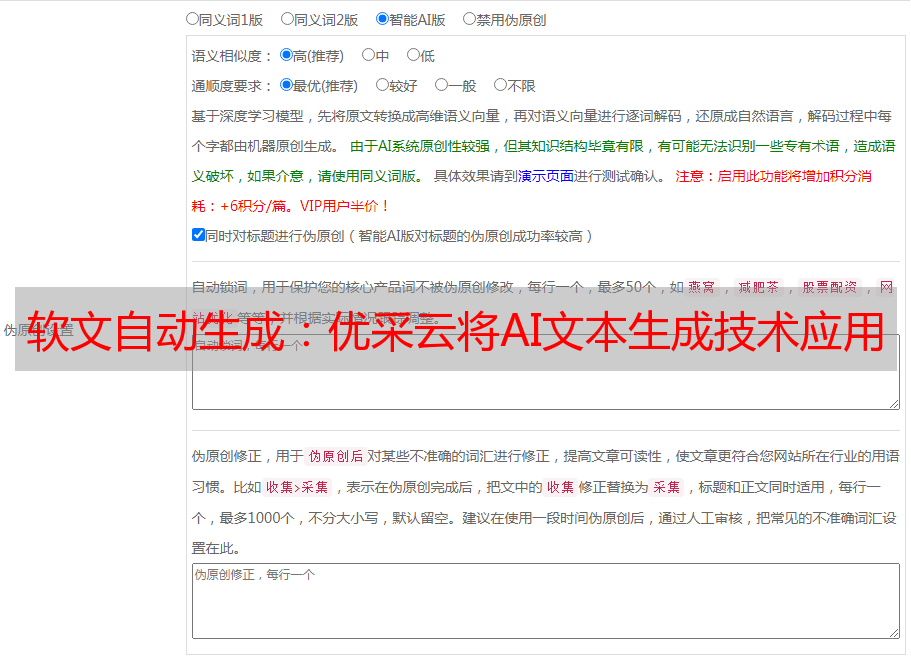 然而,随着人工智能技术的发展,这一情况正在发生变化。优采云是一个新兴的AI文写服务商,它将AI文本生成技术应用到数字营销领域,通过对用户提供的语义信息就能快速生成原创性的文章内容。