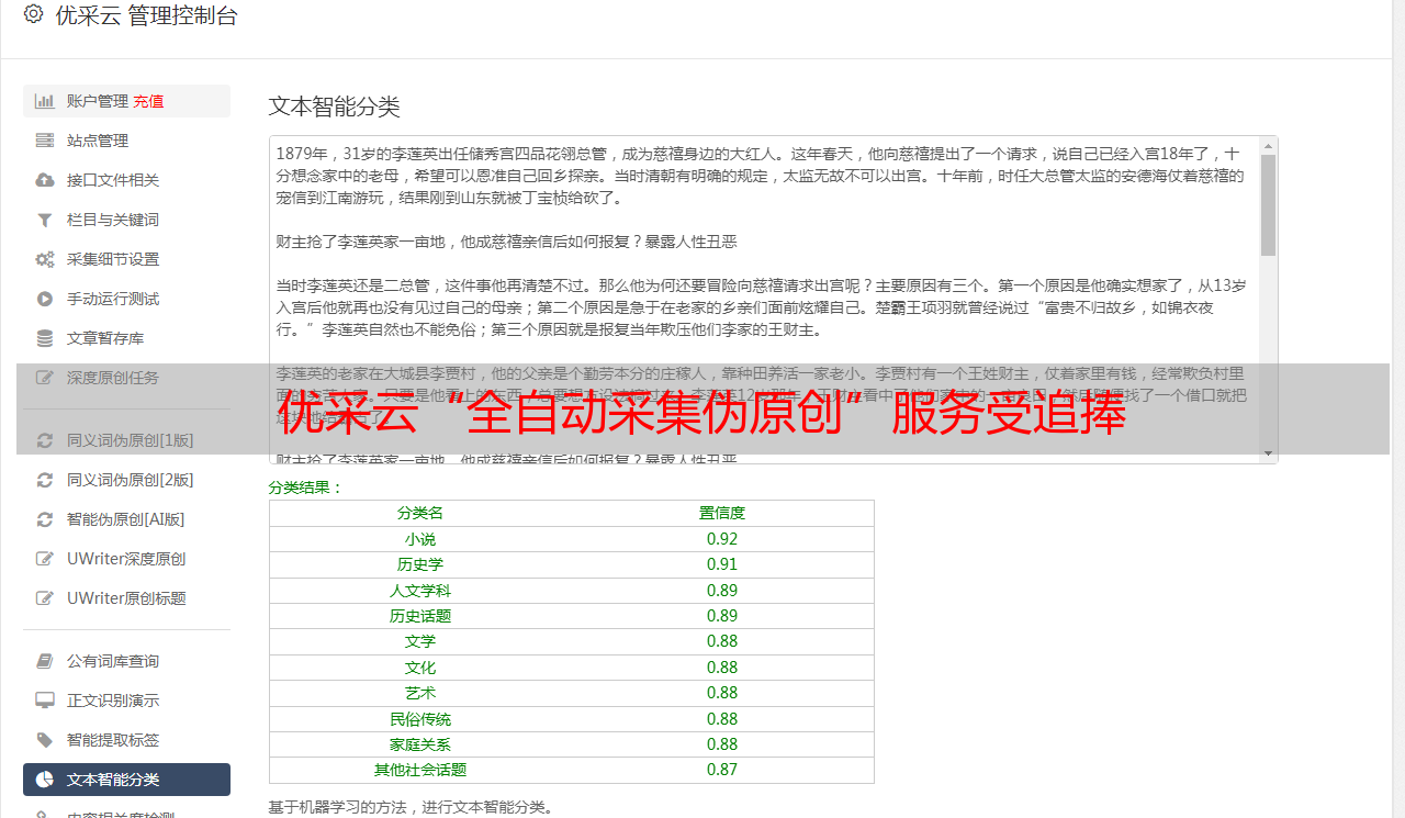 作为行业领先的“全自动采集伪原创”服务提供商——优采云(www.ucaiyun.com),其拥有超强的数据库,可以快速将各行各业的新闻、资料、微博、博客、文档等海量信息进行采集,将数据库中海量信息进行快速分析后生成出高度原创性的文章,可以根据用户需要对采集到的内容进行文字加工(如词性转化、语句变形等)此外,优采云还可以根据用户要求进行图片、文章标题等元信息的加工,并且能够根据用户所需要的文章数量来生产出用户所需要的原创内容。
