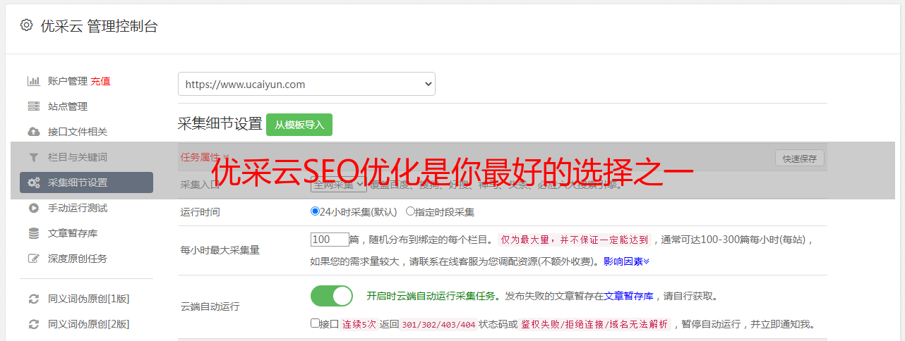 面对此类问题,优采云SEO优化诞生了。作为一款全自动采集伪原创工具,它可以根据用户所选择的关键词,从相关文章中自动采集信息并拼凑成新的内容。此外,它还可以将采集到的信息进行伪原创处理后装入你本来想要使用的文章中,使得你所发布的内容看上去是原创文章,却不存在异常或者重复。