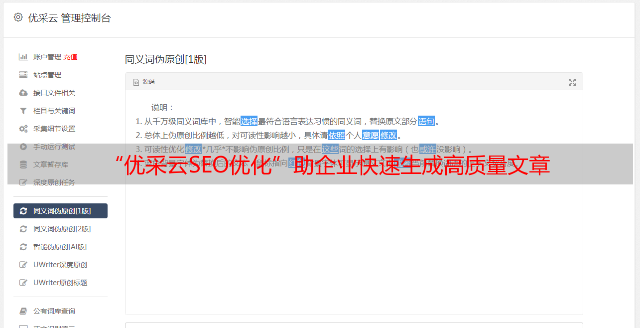 “优采云SEO优化”是一款将AI+SEO+内容三者有机结合在一起的新一代文章生成工具。如果您想要快速便捷地创作出高质量的文章内容来帮助企业数字化营销,不妨尝试使用“优采云SEO优化”工具:www.ucaiyun.