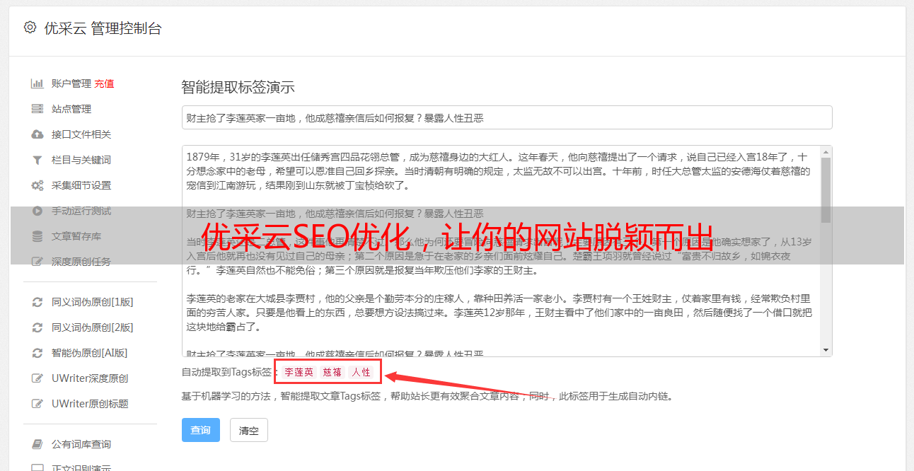 优采云SEO 优化是由国内顶尖SEO服务商——中国科学院图书馆开发的一款产品。它主要使用AI+NLP语义理解+爬虫+人工智能+语义分词+情感分析+新闻数字化+关键词语法测试+关键词库+合成新文本等多项人工技术来实现一键采集伪原创。