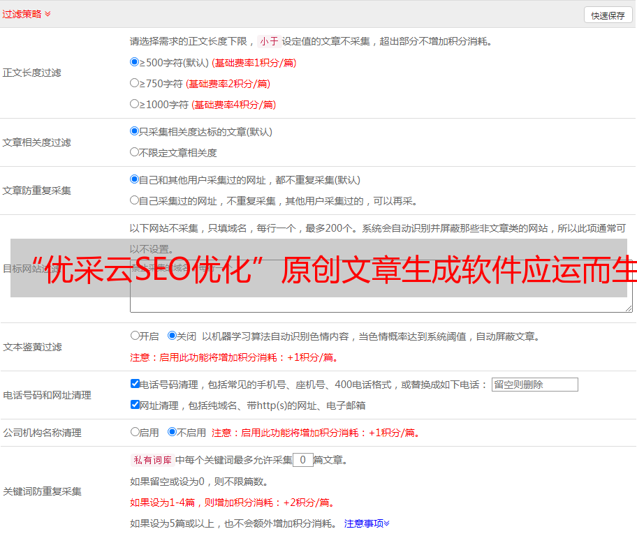 “优采云 SEO 优化”是一款专门针对SEO优化的原创文章生成软件,它可以帮助用户快速生成高质量的原创文章,并支持多语言版本(中文、英文、日文等)。它具有语法检测功能,能够及时检测出文章中存在的语法错误,并给出相应的修改建议。此外,它还具有SEO优化功能,可以将文章中的关键词进行优化,使之能够在搜索引擎中得到更好的排名。