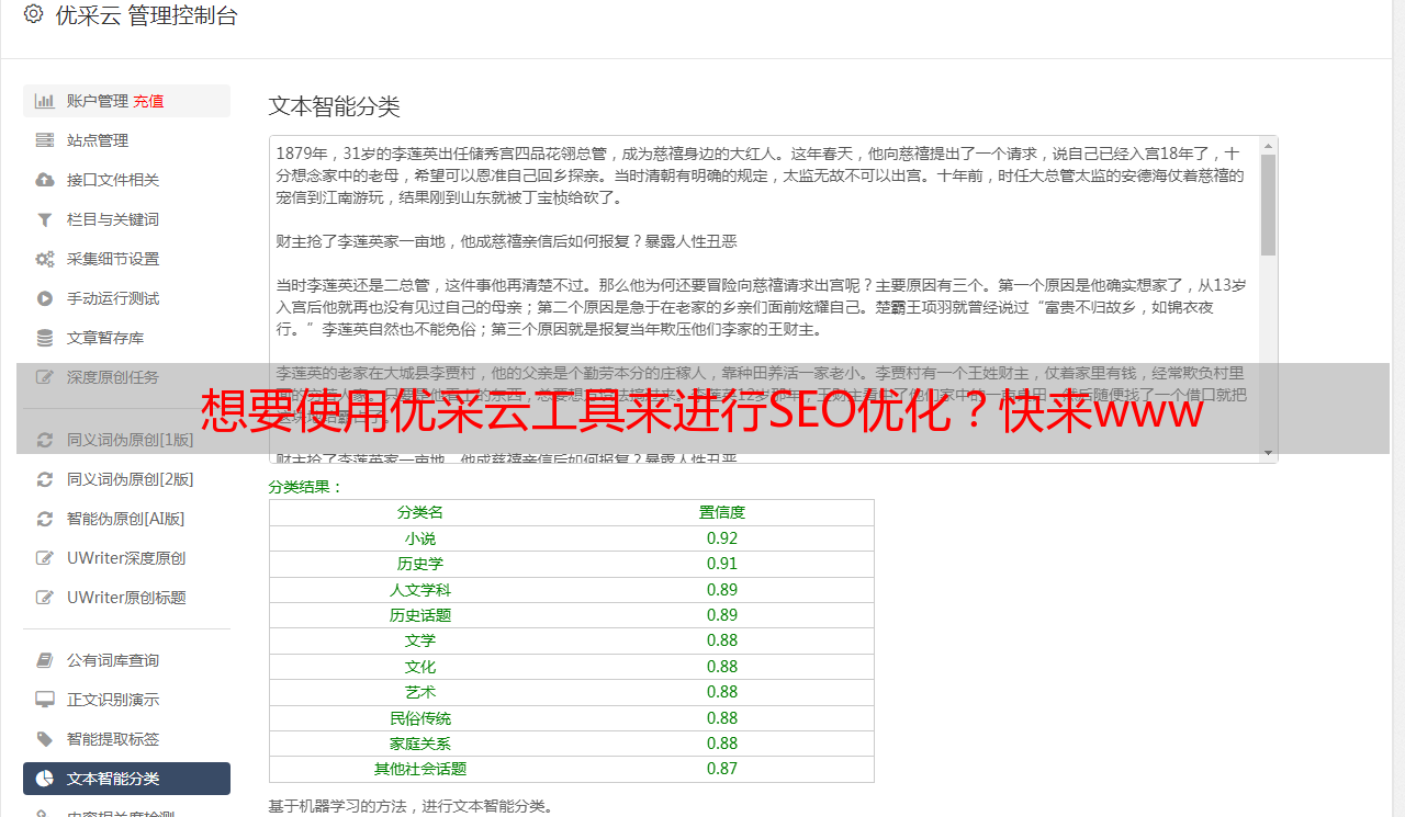 总之,优采云是一个集SEO优化、流量增加、数据分析、机器学习等*敏*感*词*于一体的工具。它可以帮助电子商务企业快速找到正确的方向,大大减少SEO优化因耗时耗力耗材而造成的浪费。想要使用优采云工具来进行SEO优化?快来www.ucaiyun.com注册体验吧!