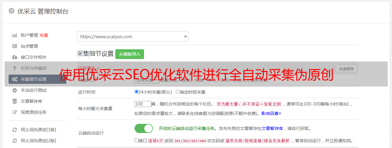 总之,使用优采云SEO优化软件进行全自动采集伪原创是一种很好的方法:不但能够大大减少人工制作内容所耗时间和成本,而且能够为不同语言、不同平台、不同格式上的用户提供大量有价值的内容。如果你想要快速、高效地为你的网站制作大量有价值的内容,那么你应该试试“优采云”SEO 优化软件(www.ucaiyun.com )!