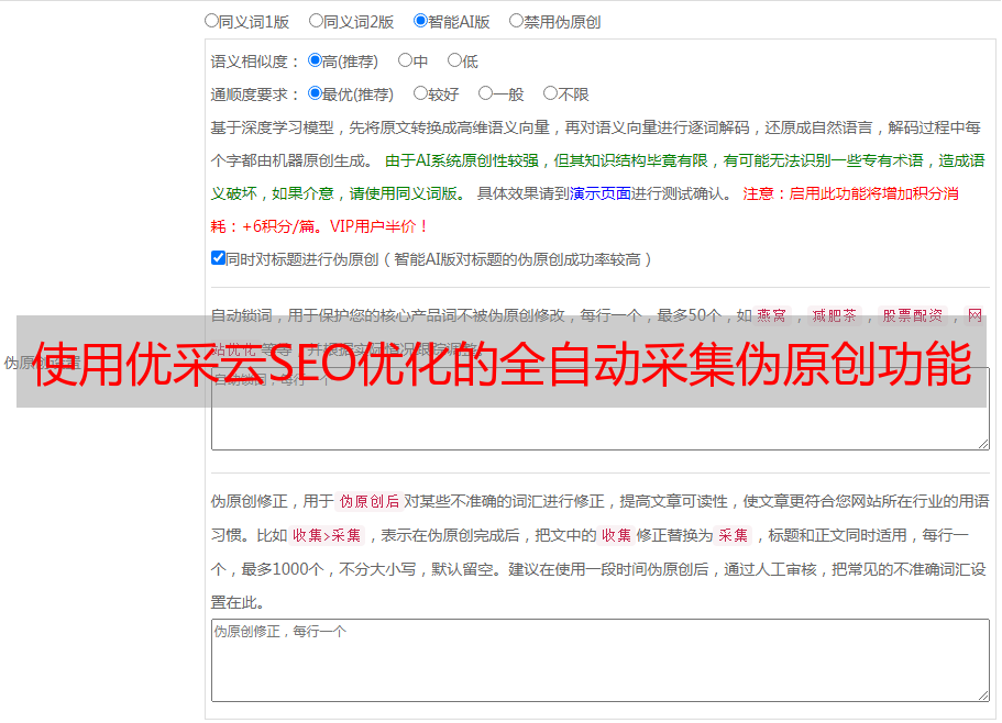 优采云SEO优化的全自动采集伪原创功能可以帮助用户快速将原始内容进行伪原创处理,使其具有新意。这样就可以避免重复内容出现在各个网站上,保证用户浏览时能够看到不同的内容。