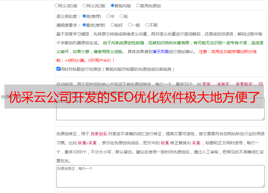 优采云公司开发的SEO优化软件是一款高效、易用的软件。它使用了大数据和机器学习技术,能够根据用户要求快速生成各种高质量、高可读性的文章。此外,它还能够根据SEO原则对文章进行优化,保证文章在网上得到合理的流量和点击量。