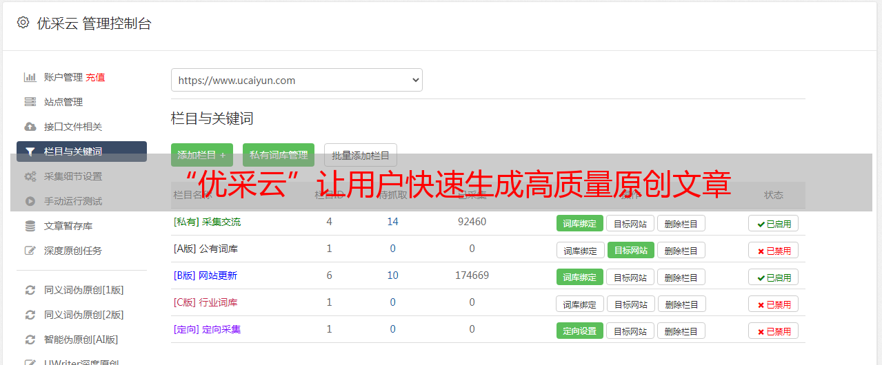“优采云”主要面向中小型企业、个人博客以及SEO服务商,帮助他们快速生成高质量、原创性强的内容。目前,“优采云”已然在*敏*感*词*上千个平台上使用并得到广泛好评。如果你想体验一下“优采云”带来的便利性和高效性,不妨前往www.ucaiyun.com这个官方网站进行试用体验。