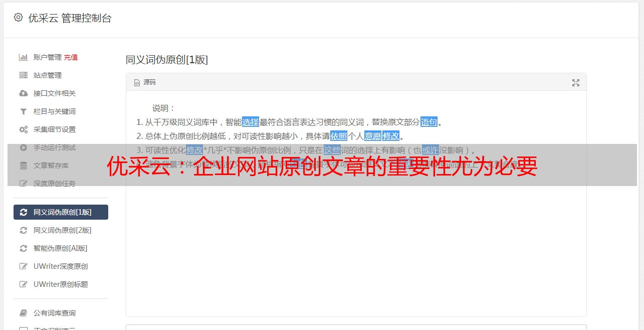 总而言之,原创文章是一家企业在建设网站时不可或缺的一部分。以上就是“优采云”SEO优化工具www.ucaiyun.com 对于企业如何通过原创文章来打造形象以及促进SEO优化效果的一些看法和思考。