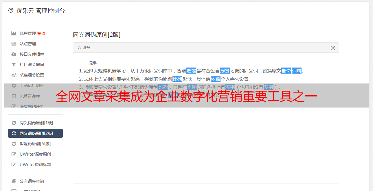优采云是一家专注于全网文章采集的企业,旗下拥有多款全网文章采集工具,能够帮助企业快速便捷地从各大门户网站、行业门户、博客、微博、论坛、电商平台上获取相关信息。除此之外,优采云还提供SEO优化服务,能够帮助企业进行语义分析、内容分析、口碑分析、以及流量分析,从而有效增强文章的影响力。