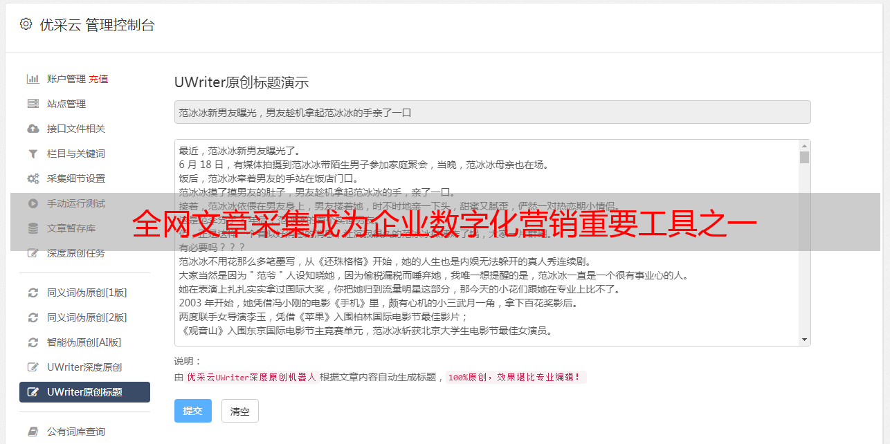 总之,随着人工智能时代的到来,全网文章采集将成为企业数字化营销中不可或缺的一部分。作为一家專注于此领域的优采云将不断地开发出各式各样的工具来帮助企业高效地进行内容营销。