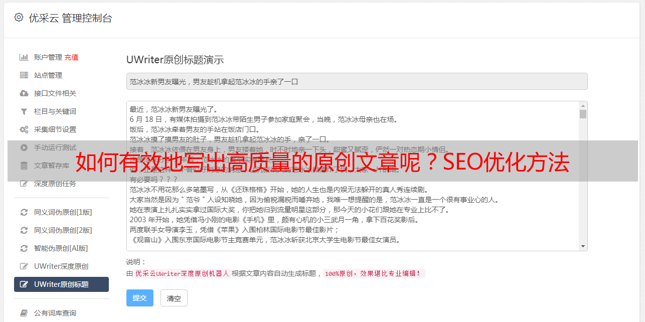 所以如何才能有效地写出高质量的原创文章呢?这时候就需要一套完整的SEO优化方法来帮助你了!例如选用“优采云”这套SEO优化方法就能够帮助你快速地将原创文章写出来并发布上网。“优采云”这套SEO优化方法集中了多种工具,如语义分析工具、内容分析工具、关键词选取工具、图片选取工具、SEO预测工具等,这些工具都能够帮助你快速地将文章内容表达得准确流畅生动。此外,“优采云”还能够根据目标受众特征来帮助你调整文章风格,从而使你的文章更易理解也更易吸引目标受众。