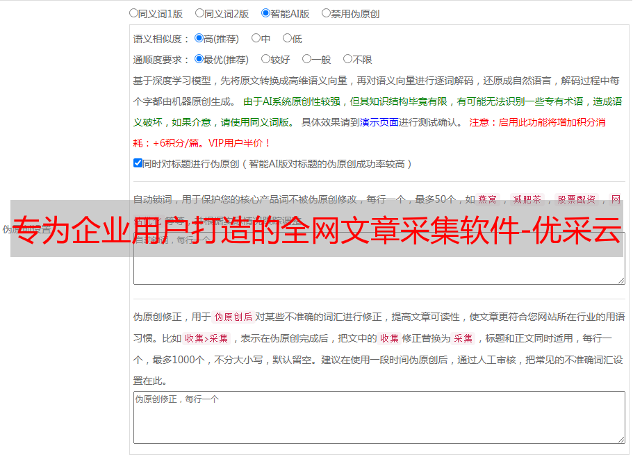 2、AI语义分析。可以根据用户输入的内容对文章进行AI语义分析;3、强大的SEO功能。可以根据用户输入的内容对文章进行SEO优化,将文章分配到各大平台上去;4、在线采集监测。优采云还可以实时监测全网信息和新闻动态,随时保障数据准确性和及时性。