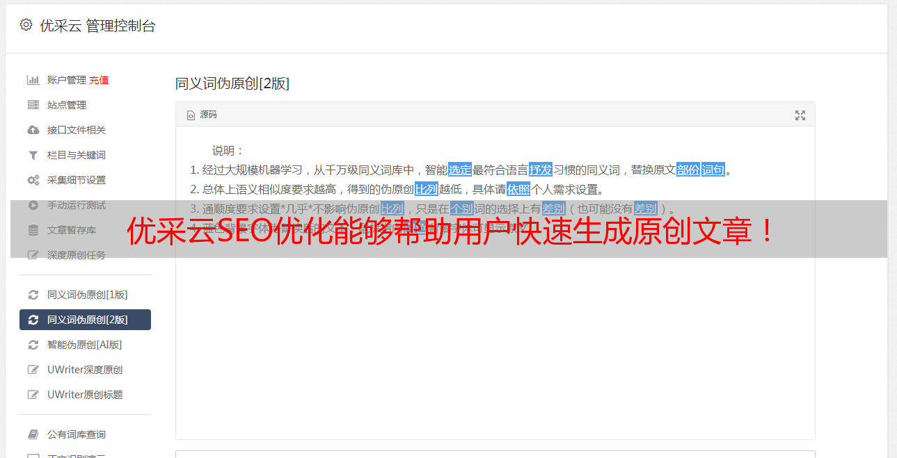 优采云SEO优化能够帮助用户快速生成原创文章!