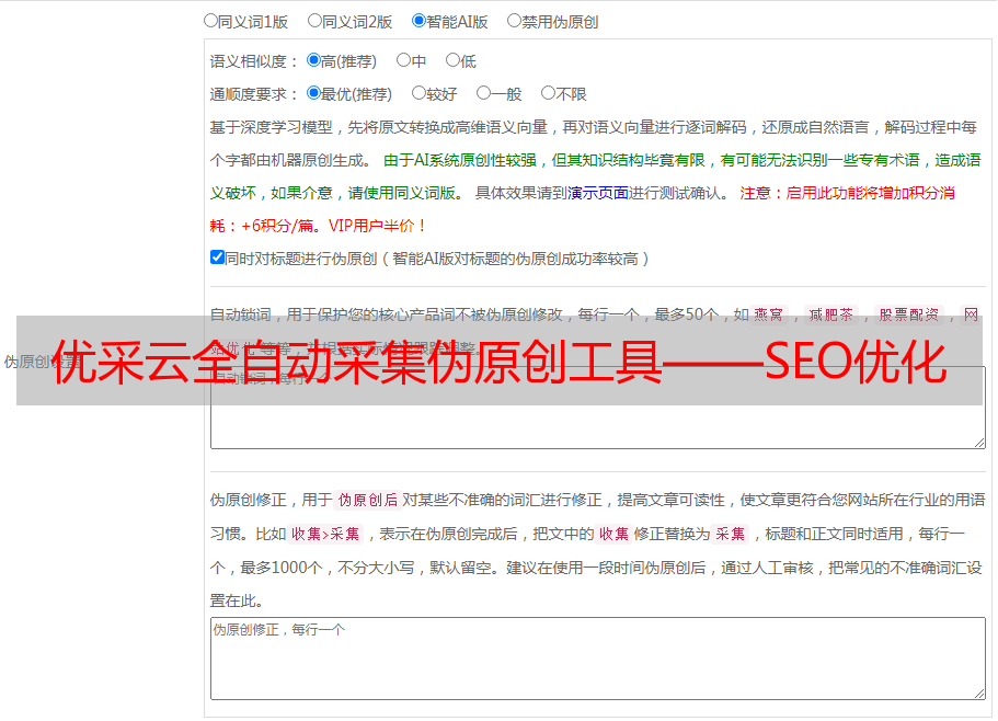 总之,SEO优化新利器是目前市面上最好用也是最有效的全自动采集伪原创工具之一。它能够帮助用户快速生成高质量、有价值且独特性强的内容,进而带来卓越的SEO效果。如果你想要尝试使用这款工具来帮助你进行SEO优化,可以前往它的官网www.ucaiyun.com 进行注册使用。