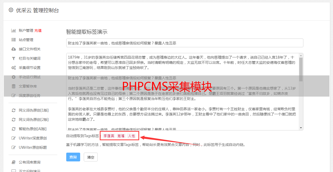 描述: 文章采集功能是通过程序远程获取目标网页的内容,并在进行本地规则分析处理后将其存储在服务器的数据库中.