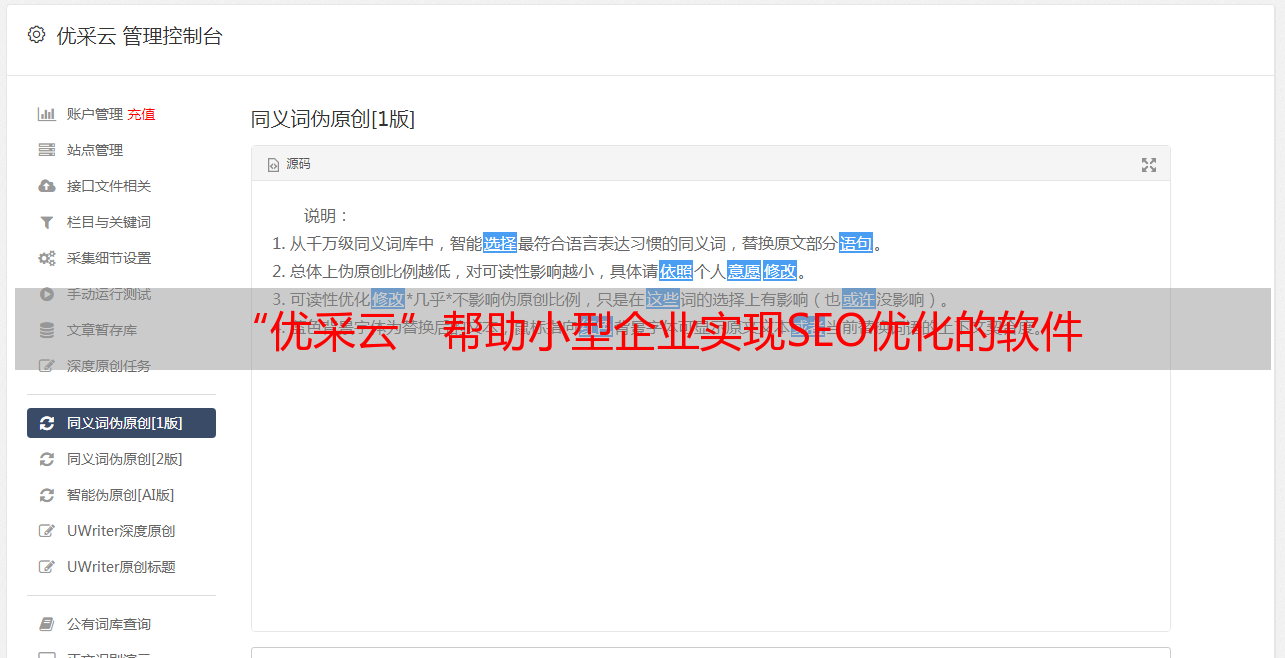 “优采云”不仅可以帮助小型企业快速实现SEO优化,而且可以帮助用户快速分析竞争对手、相关关键词、流量分布、文章权重分布等数据。通过使用这些数据,小型企业通过合理的文章分发、有效的关键词使用、准确的流量引导等方式来实现SEO优化。
