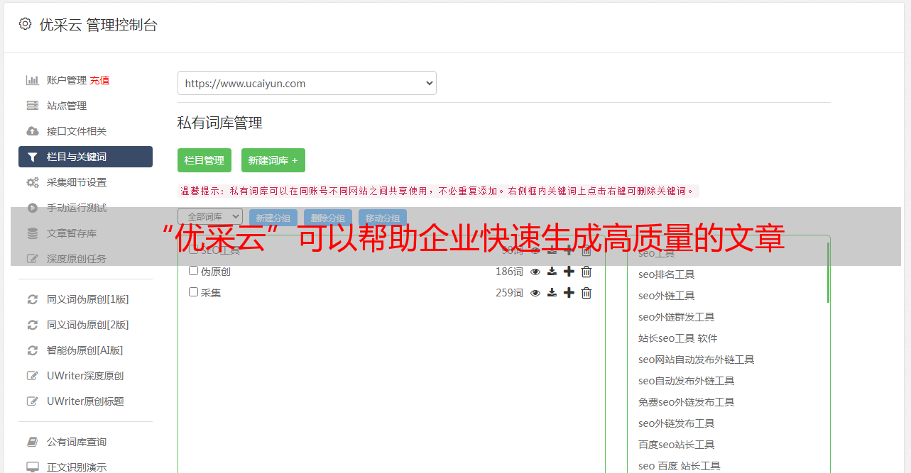 总而言之,使用“优采云”可以帮助企业快速生成高质量、SEO友好的文章内容。该软件拥有强大的SEO优化功能、快速生成文章内容、寻找相关信息并将其汇集到一处、根据用户所在地区和行业需要快速生成各种行业领域内容等多项功能。如想体验“优采云”带来的便利性和效率性,只需前往官方网站www.ucaiyun.com即可开始体验。