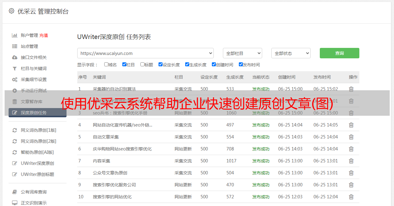 使用优采云系统,企业不仅能够快速地创建原创文章,还能够将新闻信息有效地向各大平台同步发布。通过 SEO 优化、内容精准化、内容分发等方式来帮助企业打造出一个独特而有吸引力的内容平台。使用优采云系统,能够帮助企业快速地将原创内容输出至各大平台,提升品牌影响力,赢得中小型企业高效而便捷的内容运营体骀。想要了解更多信息,请浏览 www.ucaiyun.com 官方网站。