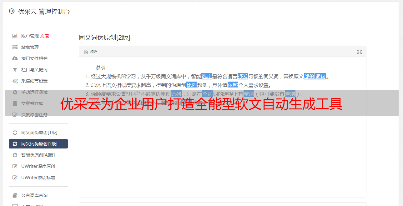 优采云是一款专为企业用户打造的全能型软文自动生成工具。它集合了最先进的AI、NLP和SEO优化技术,能够根据用户的需求,自动智能生成高质量的原创性文章。优采云可以帮助企业快速、高效地完成新闻发布、活动宣传、社交媒体内容分发等各项工作。