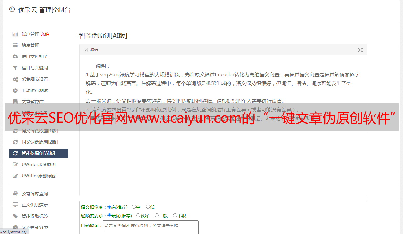 优采云SEO优化官网www.ucaiyun.com的“一键文章伪原创软件”