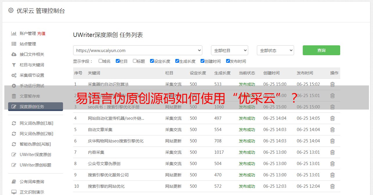 总之,易语言伪原创源码是一项非常有用的SEO工具,能够有效地帮助你快速、准确地将内容进行去重处理和发布。如果你想要尝试使用易语言伪原创源码来助力SEO优化,不妨使用“优采云”这一专业的SEO工具——详情请访问官网www.ucaiyun.